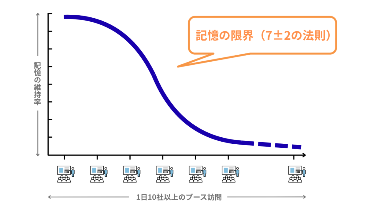 合同説明会(以下、合説)に参加する学生は、わずか1日で10社以上のブースを巡ります。短時間で膨大な情報にさらされる学生の脳内では、処理できる情報量の限界を容易に超えてしまいます。