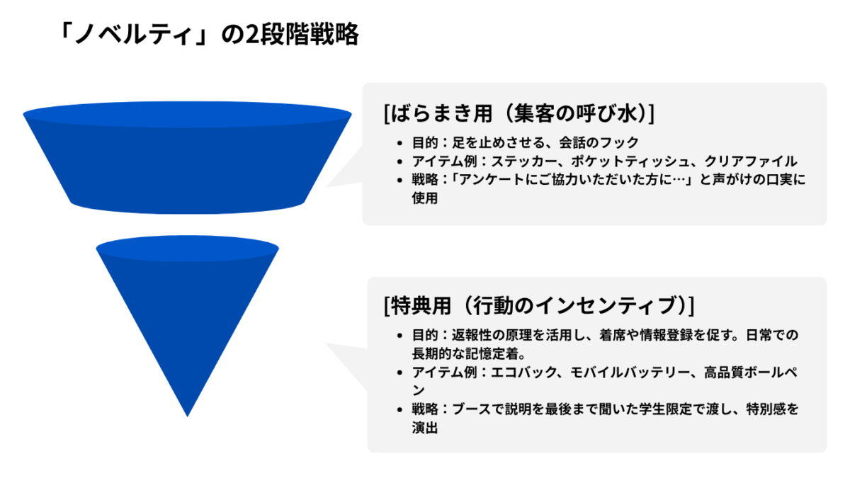 ノベルティは単なる「おまけ」ではなく、学生の生活に入り込み、繰り返し企業名を思い出させる「アンカー(記憶の定着装置)」です。